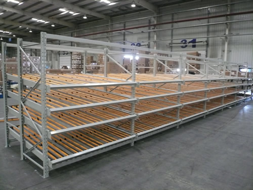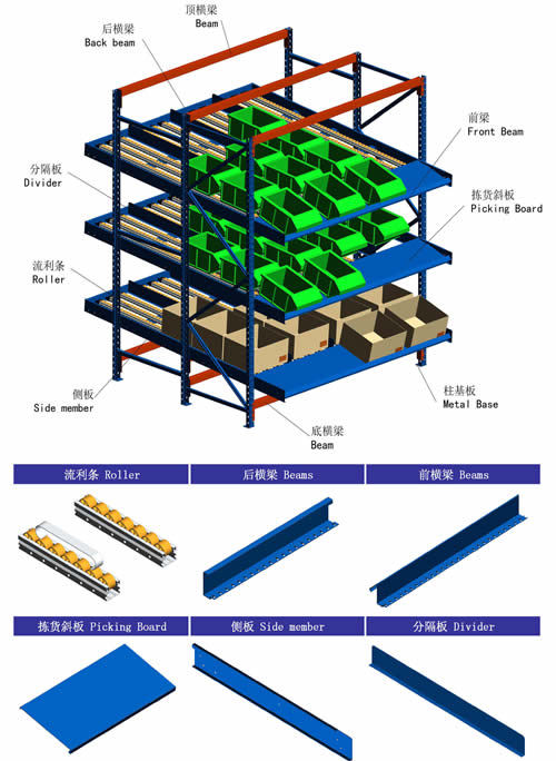 流利式貨架又稱(chēng)滑移式貨架,采用輥輪鋁合金,鈑金等流利條,利用貨物臺(tái)架的自重,從一邊通道存貨,另一邊通道取貨實(shí)現(xiàn)先進(jìn)先出,存儲(chǔ)方便,以及一次補(bǔ)貨多次取貨。流利架存儲(chǔ)效率高,適合大量貨物的短期存放和揀選。可配電子標(biāo)簽,實(shí)現(xiàn)貨物的輕松管理,常用滑動(dòng)容器有周轉(zhuǎn)箱,零件盒及紙箱,適合大量貨物和短期存放和揀選。適合大量貨物的短期存放和揀選。廣泛應(yīng)用于配送中心、裝配車(chē)間以及出貨頻率較高的倉(cāng)庫(kù)。