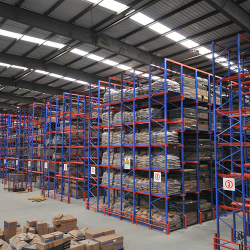 由于其存儲(chǔ)密度大,對地面空間利用率較高,常用在冷庫等存儲(chǔ)空間成本較高的地方。通廊式貨架非常適合那些貨品種類少但儲(chǔ)藏量大的倉儲(chǔ)應(yīng)用。叉車可自由的進(jìn)出于貨架之間的走廊從而使倉庫得到最大限度的利用。