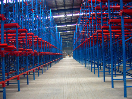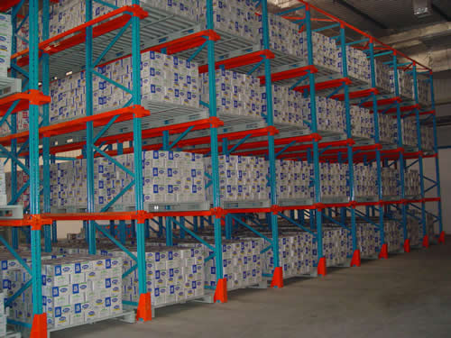 通廊式貨架又稱為駛?cè)胧截浖芑蜇炌ㄊ截浖?。是一種不以通道分割的、連續(xù)性的整棟式貨架,在支撐導(dǎo)軌上,托盤按深度方向存放,一個(gè)緊接著一個(gè),這使得高密度存儲(chǔ)成為可能。